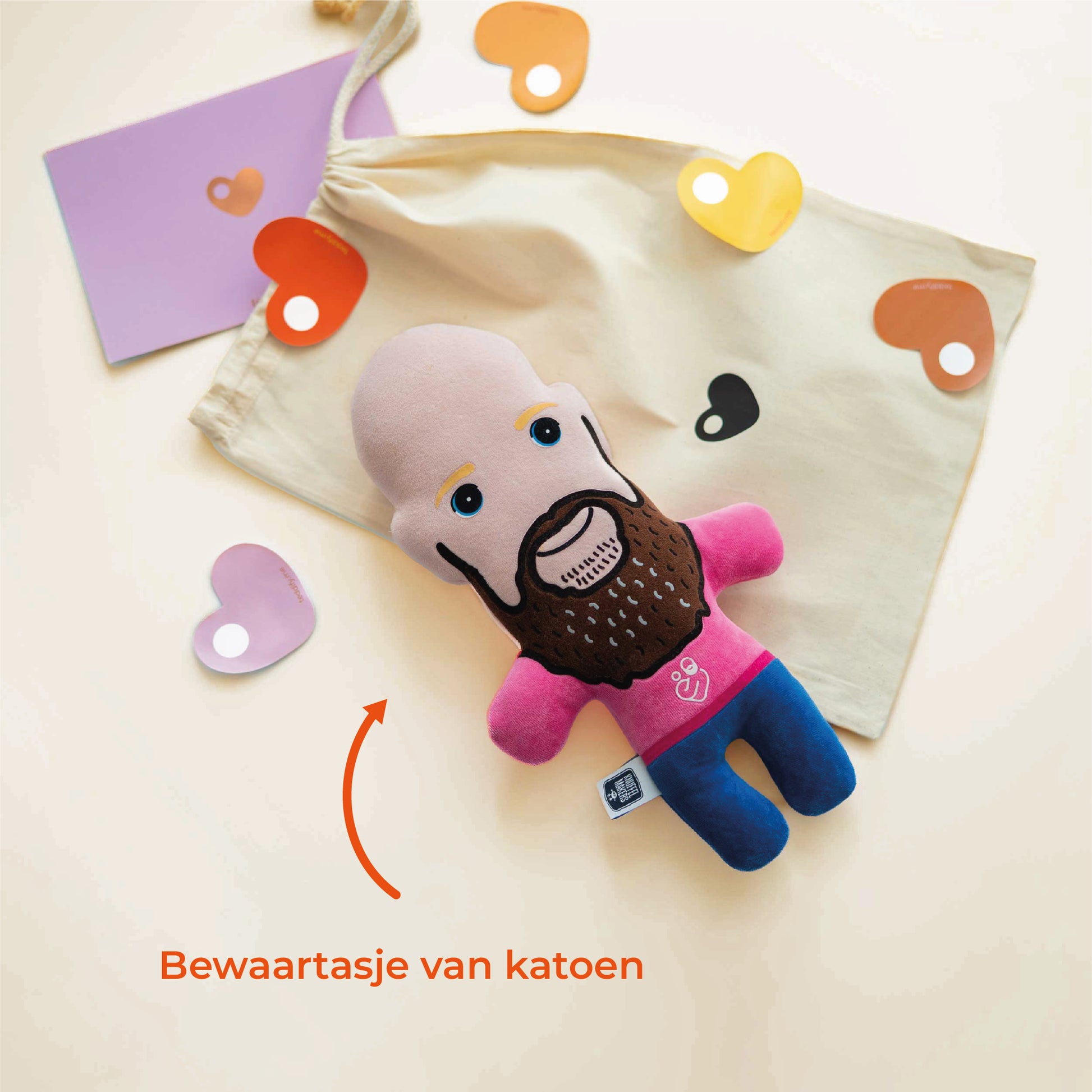 Hoe het werkt: Ieder portret is uniek handwerk. Je ontvangt binnen 1-2 werkdagen een digitaal ontwerp ter goedkeuring; pas als jij helemaal blij bent, maken we de knuffel met de hand voor je klaar.